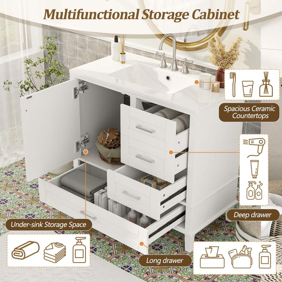 36-Inch Modern White Bathroom Vanity Storage Cabinet Solid Pine Frame with 1 Soft Close Door and 3 Drawers Series WF321698