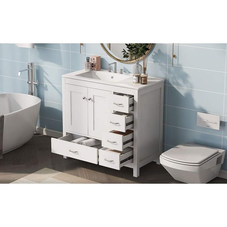 Mobile Bagno Bianco da 36 Pollici con Ampio Spazio di Archiviazione, Armadietto a 2 Ante con Chiusura Ammortizzata e 5 Cassetti, con Lavabo in Ceramica Integrato