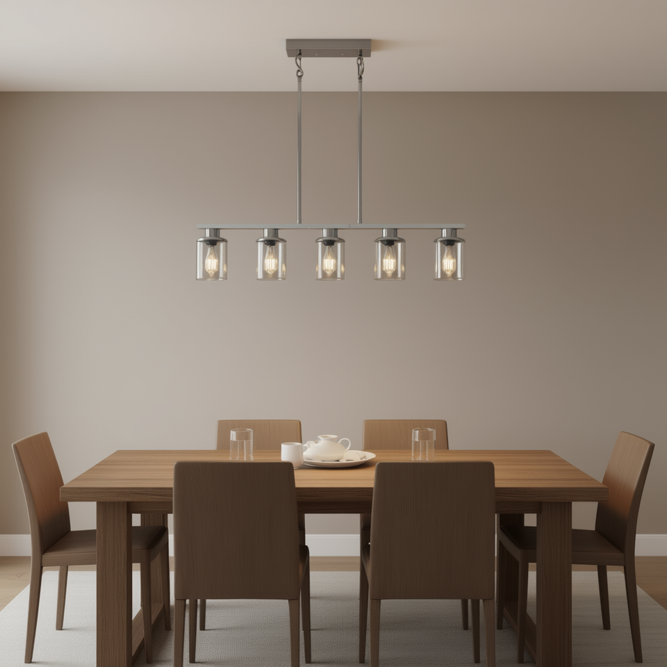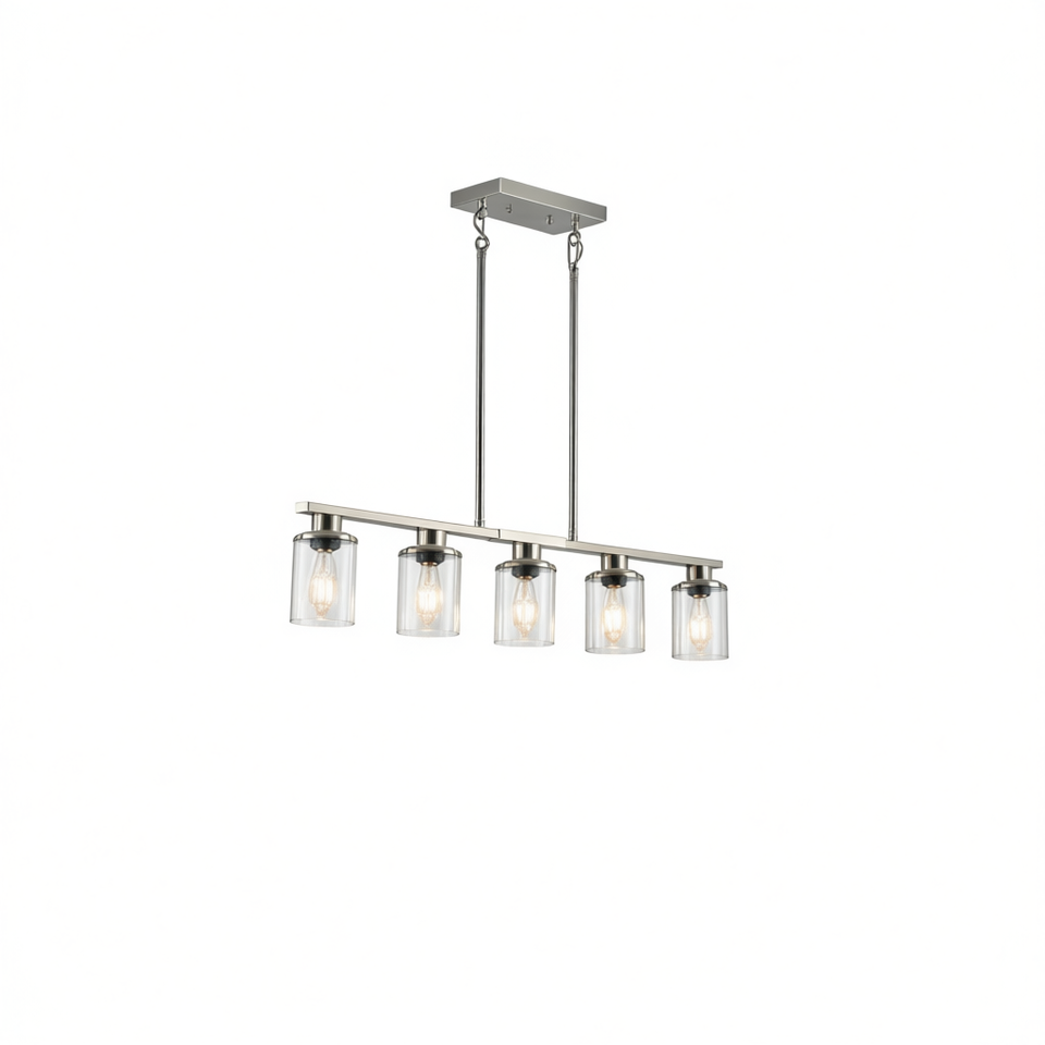 Contemporary Chrome Iron Kitchen Island Pendant Light 5 Light Brushed Nickel Chandelier Clear Glass Shades Dining Room