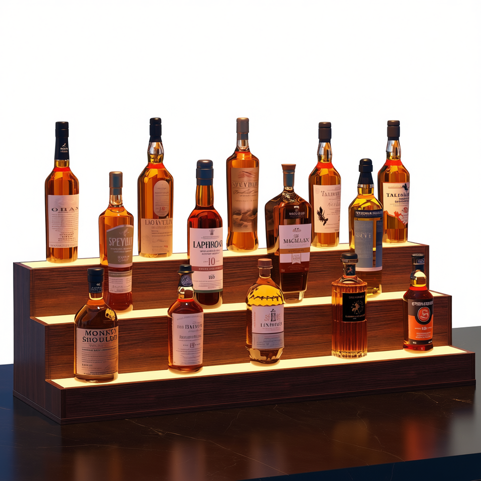 Espositore Illuminato a LED per Bottiglie di Liquore in Noce, 37 Pollici, Scaffale Illuminato per Bar Domestico/Feste, Telecomando, 3 Livelli, Autoportante