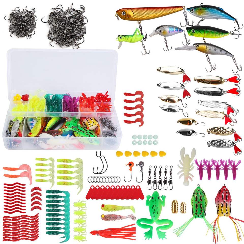 Kit di 375 esche artificiali realistiche (Popper, Crankbait, Grillo, Rana, Cucchiaino) per acqua salata e dolce, con scatola da pesca essenziale