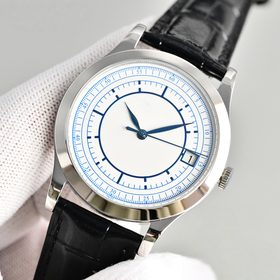 38mm Luxury Men Automatic Mechanical Watch Silver Sector Dial Blue Track Scale Date Display Sapphire Glass Wristwatch