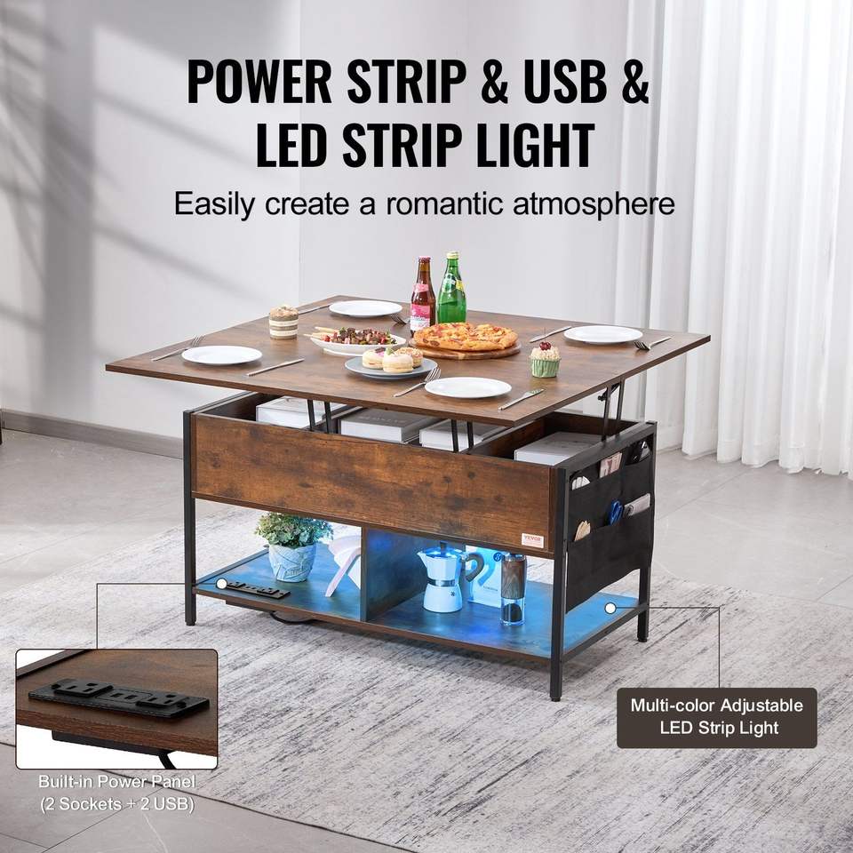 Tavolino da Caffè Rettangolare con Piano Sollevabile da 39,4 Pollici, Tasche Extra per Stoccaggio e Presa di Corrente Ribaltabile Compatibile con Standard USA