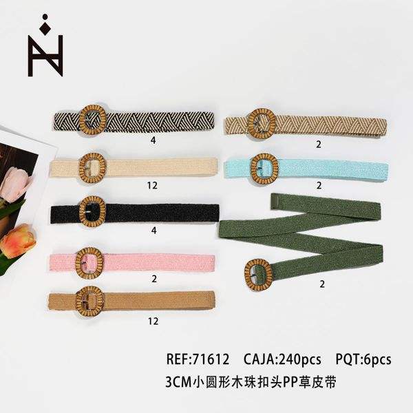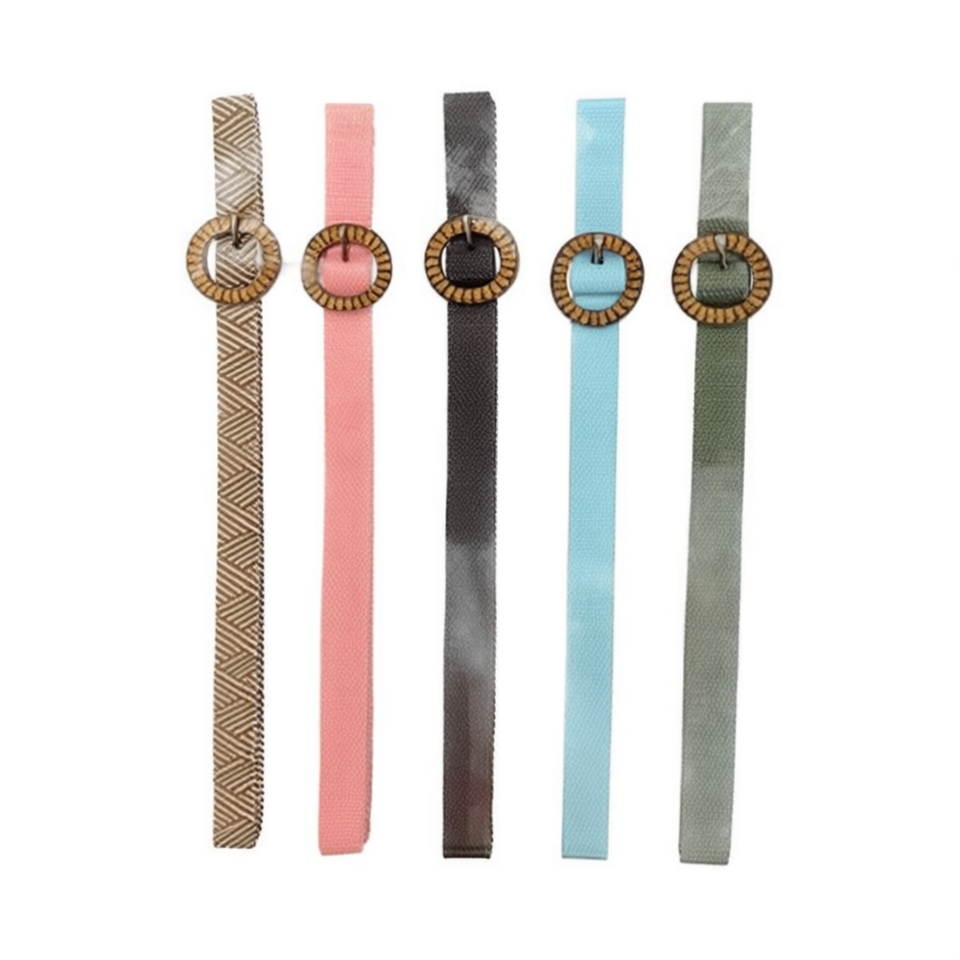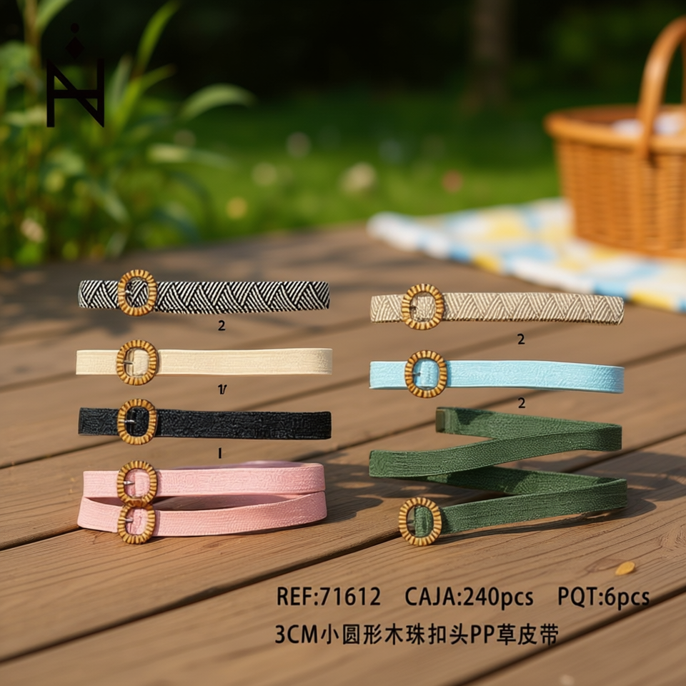 Cintura in Tessuto con Fibbia Rotonda in Legno da 3 Cm e Dettagli in Paglia PP