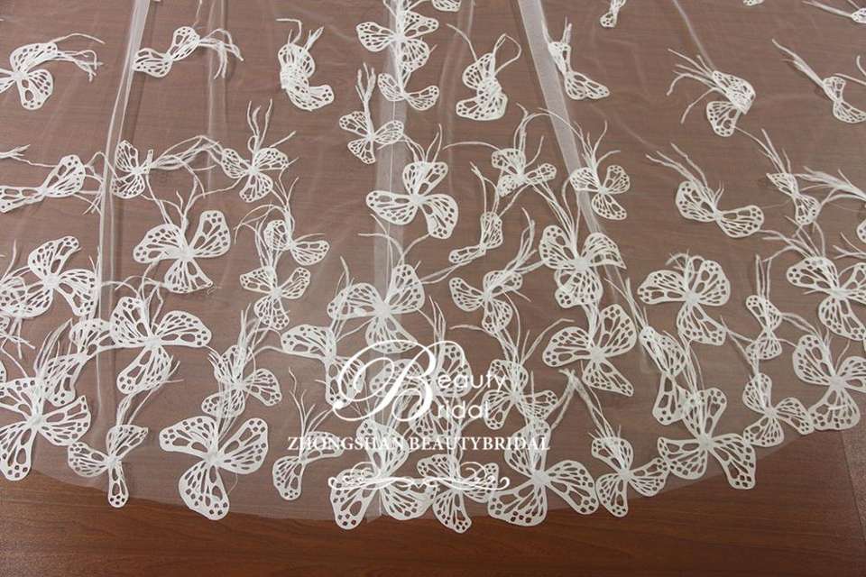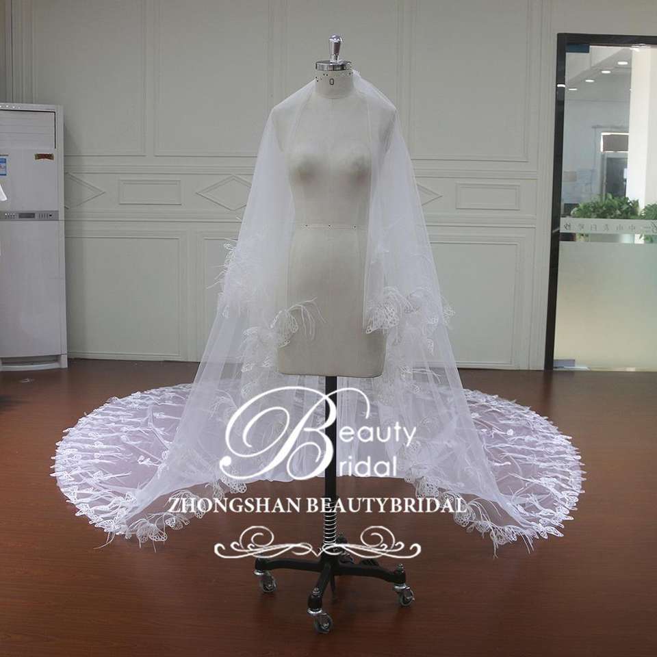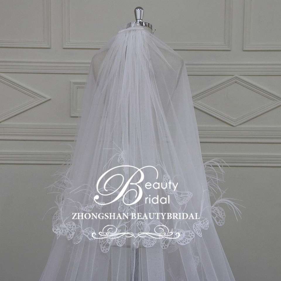 3D fiore di pizzo e piuma lungo due strati di nozze velo di nozze abiti accessorio per la sposa