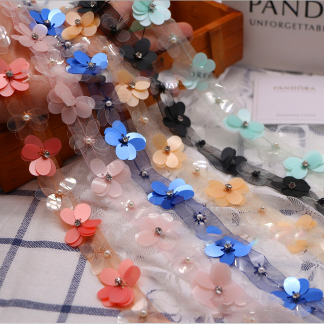 Nastri di pizzo di fiori in plastica 3D con perline con paillettes per abbigliamento