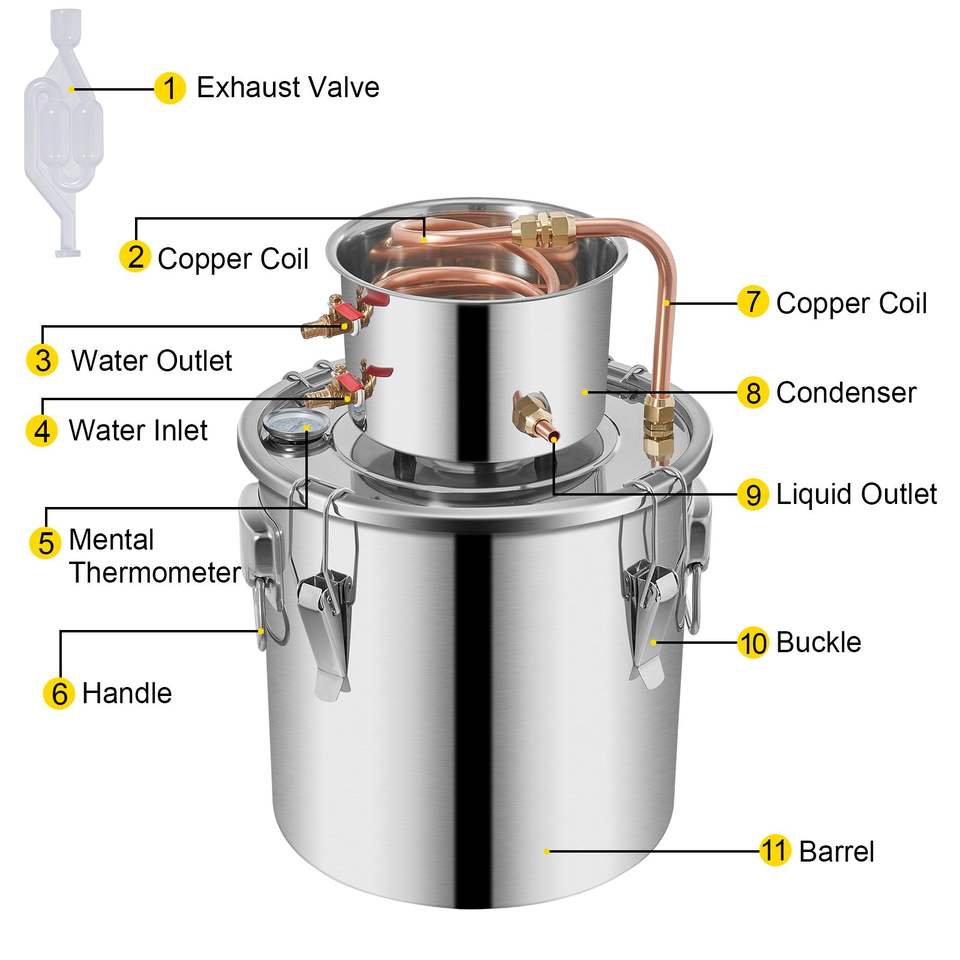 Kit di Distillazione Domestica in Acciaio Inox da 3 Galloni/12L con Tubo in Rame e Termometro Integrato per Distillazione Fai-da-Te di Whisky, Vino e Alcol