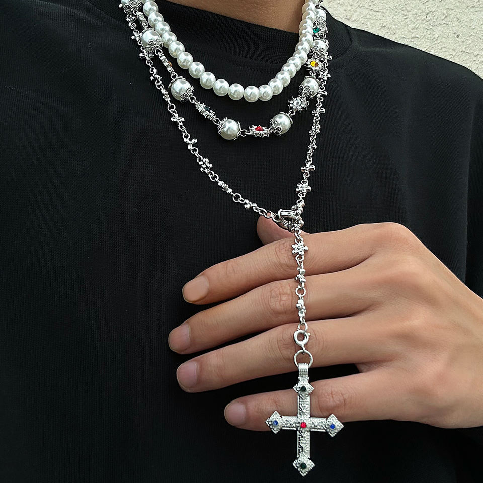 Set da 3 Pezzi Collana a Strati con Ciondolo a Croce, Perle Simulate e Fiorellino per Uomo, Choker Maschile di Tendenza per Tutti i Giorni, Accessori di Gioielleria alla Moda