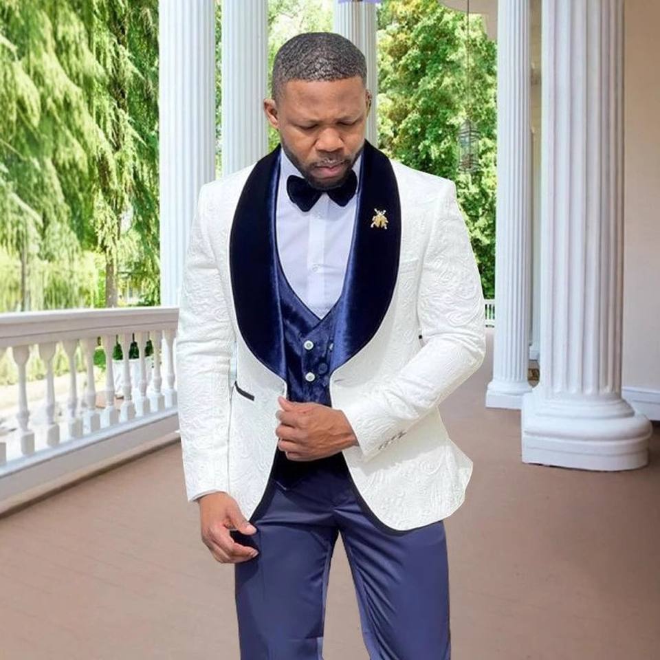 Completo da Sposo 3 Pezzi: Giacca Bianca con Motivo, Pantaloni Neri, Gilet Verde con Risvolto a Scialle, Blazer e Pantaloni da Uomo