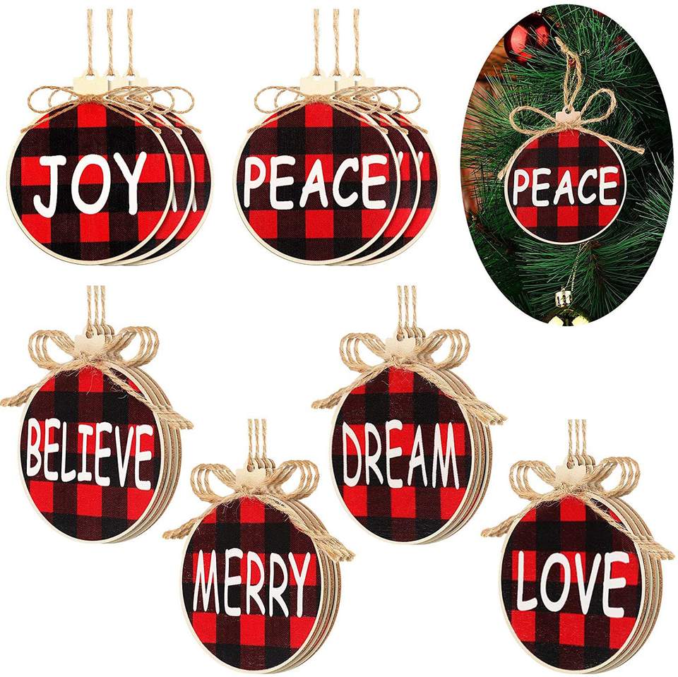 3pcs/Bag Christmas Wishes Tree Ornament Buffalo Plaid Printed Wood Hanging Christmas Ornament Tree Wooden Hanging Crafts