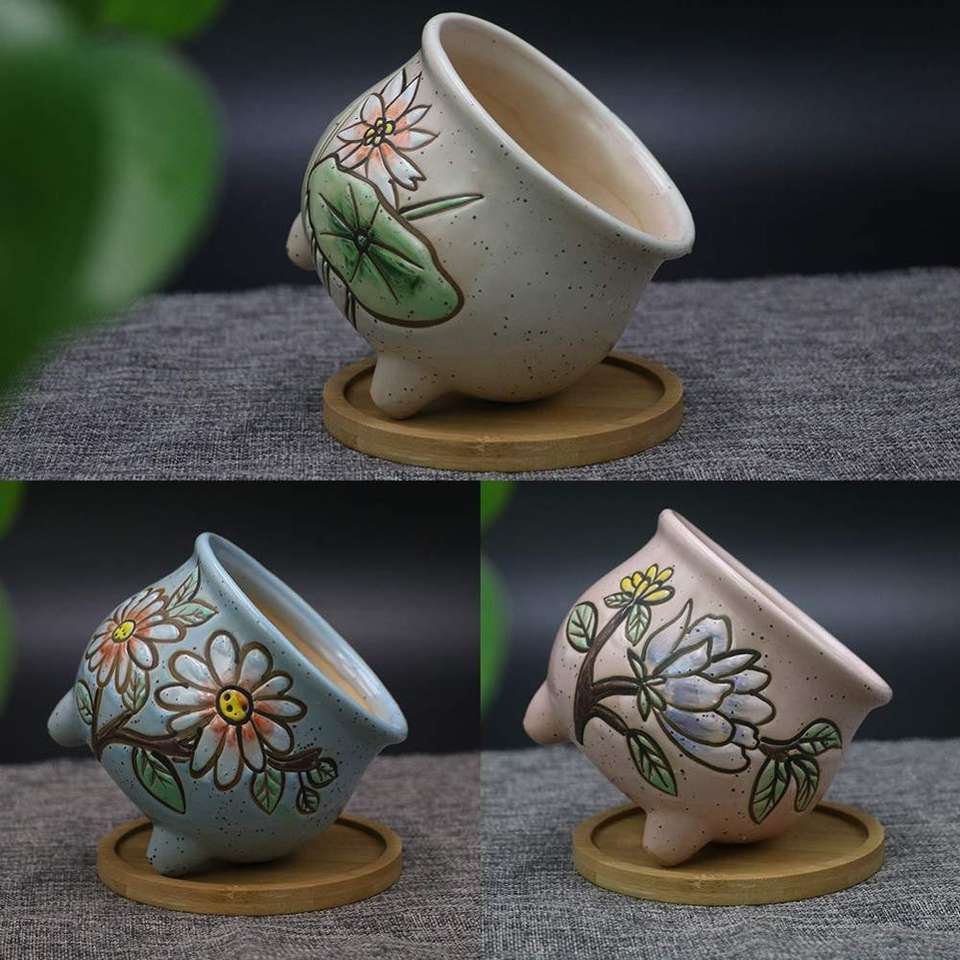 4.5 pollici Dipinta A mano di Grandi Dimensioni In Ceramica Succulente Planter Vaso di Fiori Moderna Scrivania Cactus erba Fiore con Vassoio di Bambù Coperta