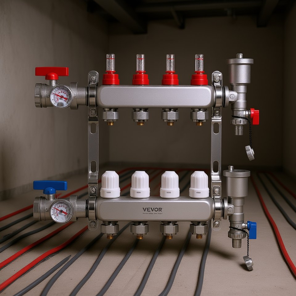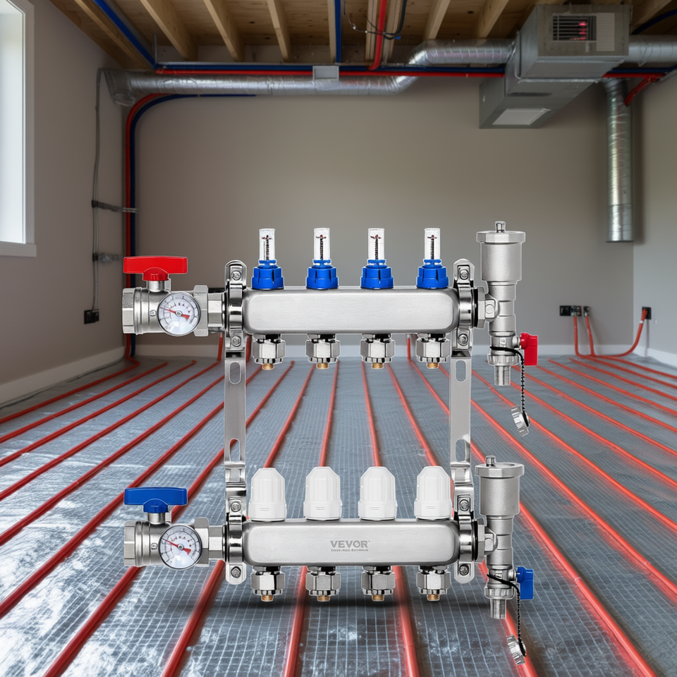 Kit Collettore di Distribuzione a 4 Vie per Riscaldamento Radiante 1/2 Pollice PEX in Acciaio Inossidabile per Sistema di Riscaldamento a Pavimento Idronico
