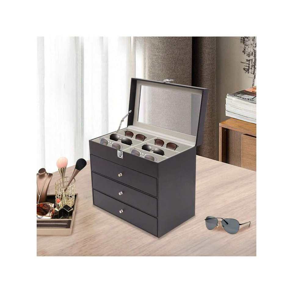 4-Layer Black Eyeglasses Storage Organizer Case Sun-Glass Watch Display Box with Lockable Drawers Made From PC PU MDF