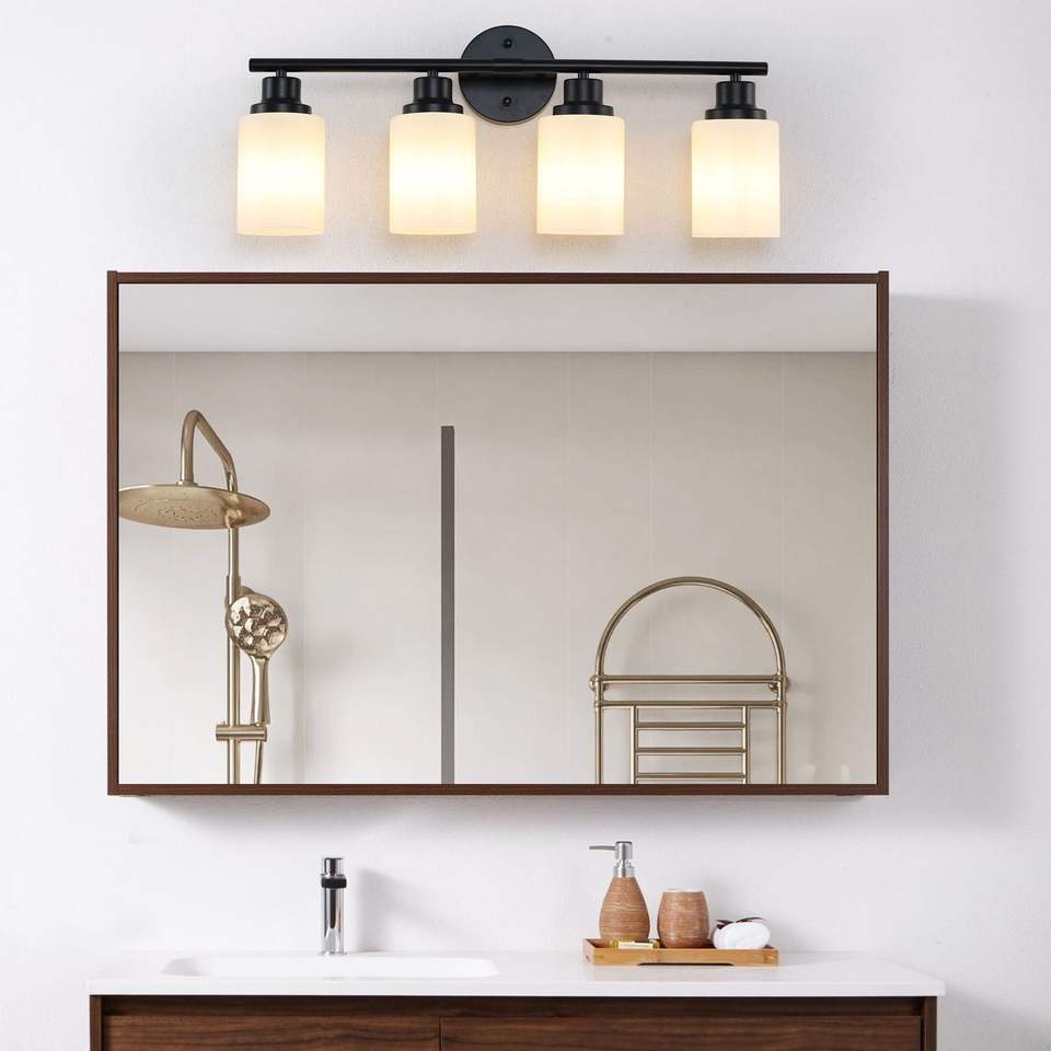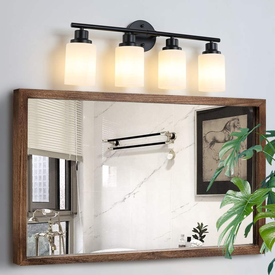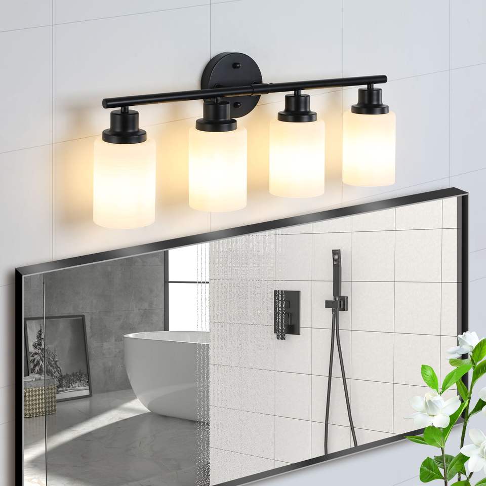 Specchio da Bagno Moderno a 4 Luci da 24 Pollici con Vetro Smerigliato Bianco e Cornice in Ferro Nero, Applique da Parete Contemporanea per Camera da Letto