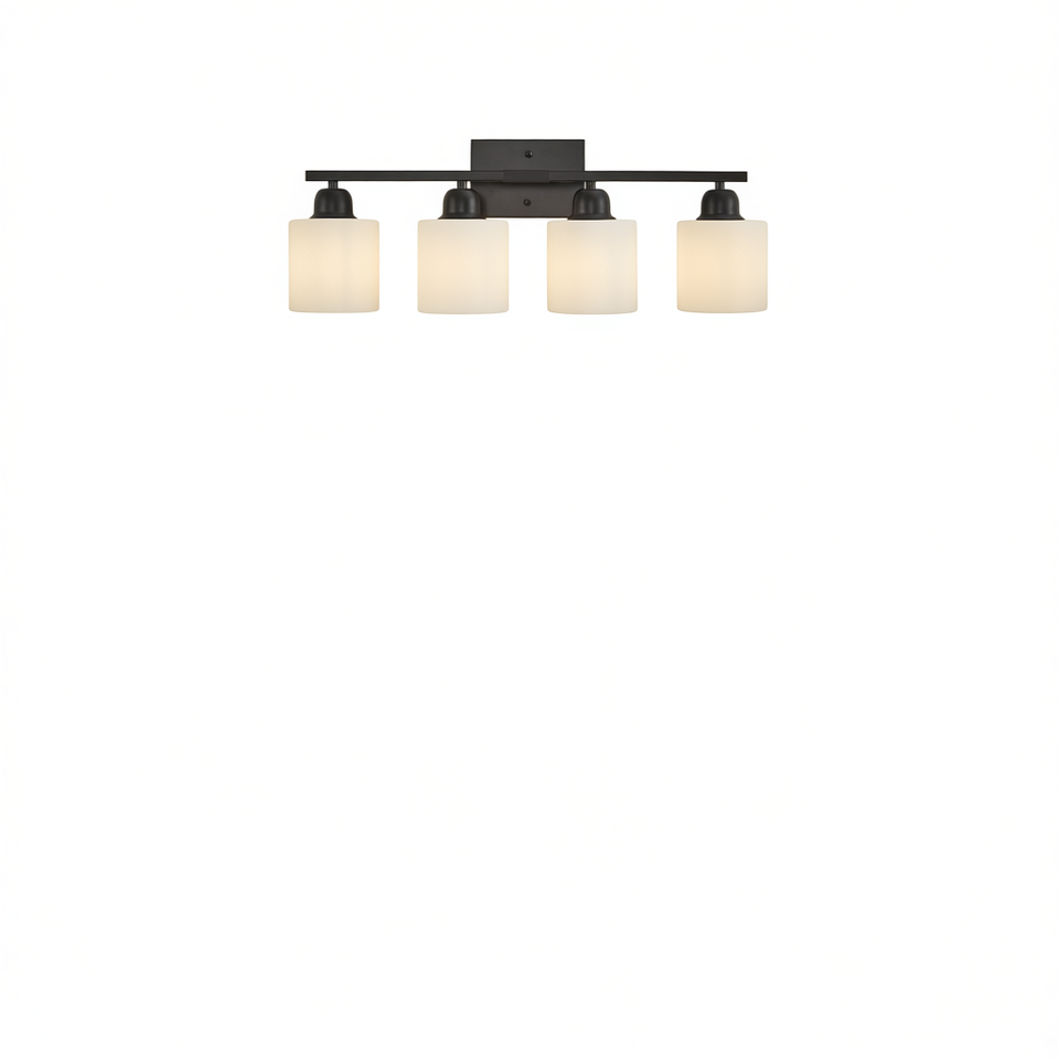 Lampada Moderna per Specchio da Bagno a 4 Luci, in Ferro Nero, Montaggio a Parete, Attacco E26, Vetro Satinato Bianco Latte, Dimmerabile, IP54