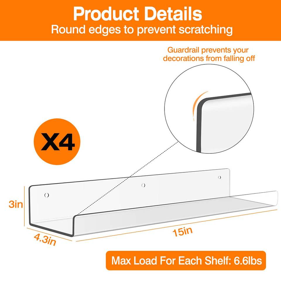 Set di 4 Mensole Galleggianti in Acrilico Trasparente da 38 cm, Montaggio a Parete, 2 Metodi di Montaggio, Organizzatori per Cucina, Studio, Soggiorno