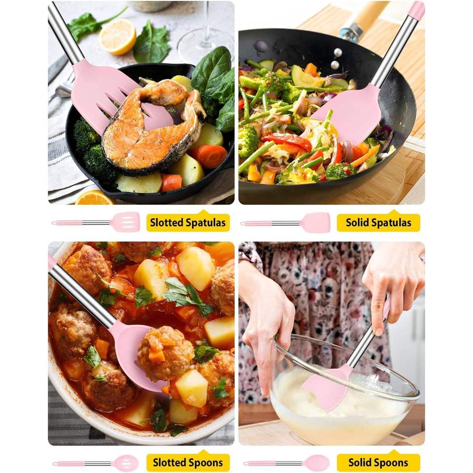 4-Pack Silicone Cooking Utensils Set Non-Stick Large Solid Spatulas Heat Resistant Pink Slotted Spoons BPA Free Kit