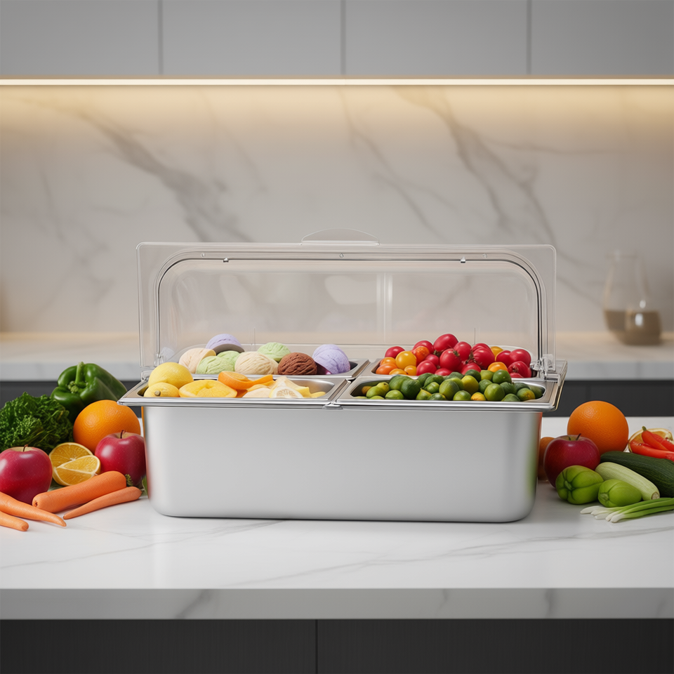 Modern Rectangular Food Serving Display Container with Flip Top Lid Divided Metal Injection Storage for Kitchen Party Use
