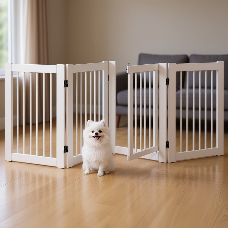 Recinzione per Cani in Legno Bianco a 4 Pannelli, Cancello per Animali Domestici Alto 30 Pollici, Design Moderno Autoportante per Interni con Chiusura a Scatto