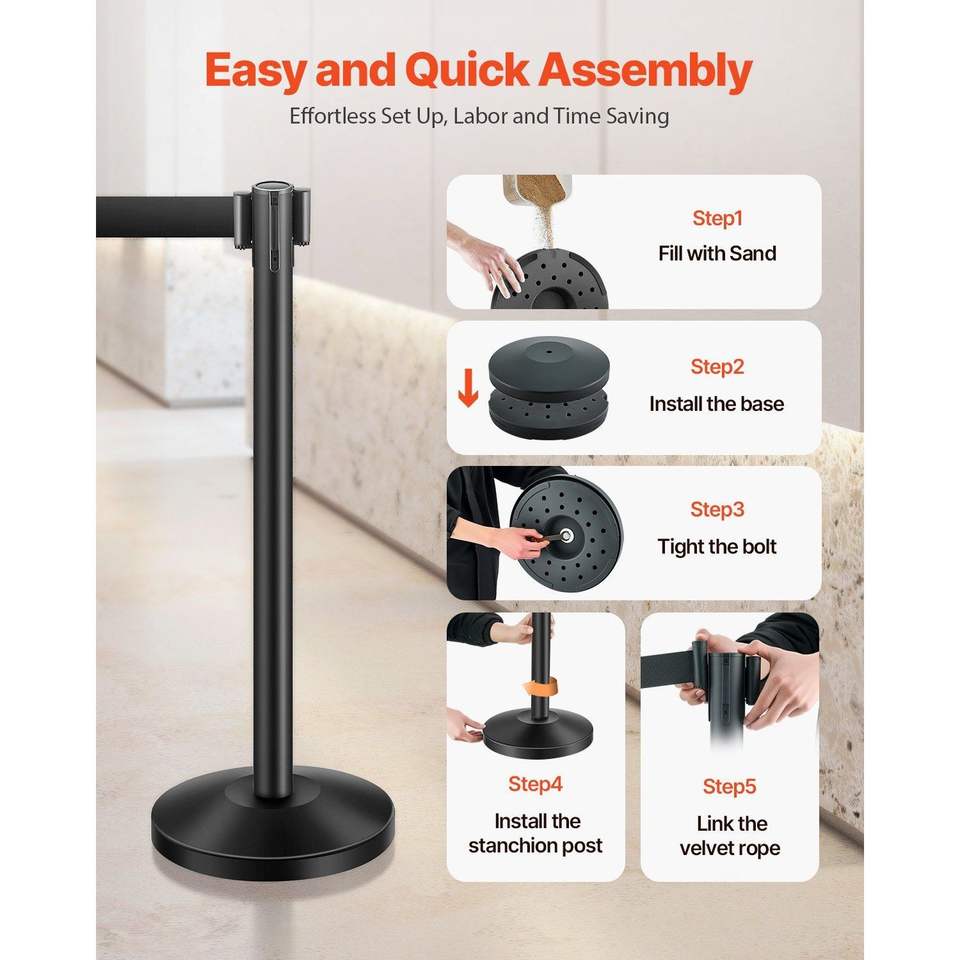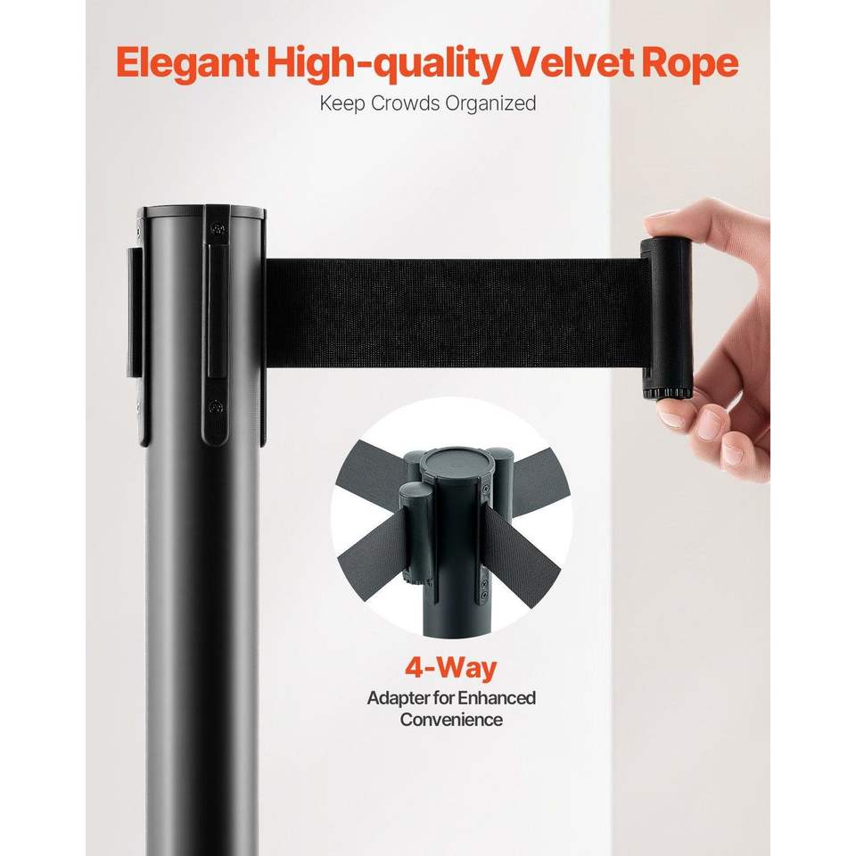 4 Pezzi Pali Divisori con Cinture Retrattili in Acciaio al Carbonio Nero, Base Cava con Iniezione di Sabbia, Prodotti per il Controllo Accessi