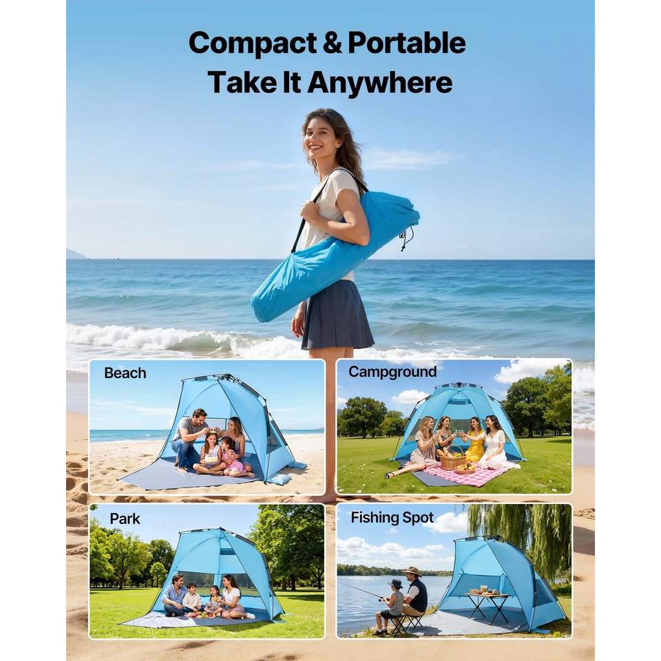 Tenda da Spiaggia Portatile Pop-Up per 4 Persone con Protezione Solare UPF 50+, Tettoia Parasole e Borsa per il Trasporto per la Sabbia