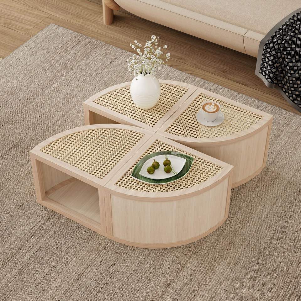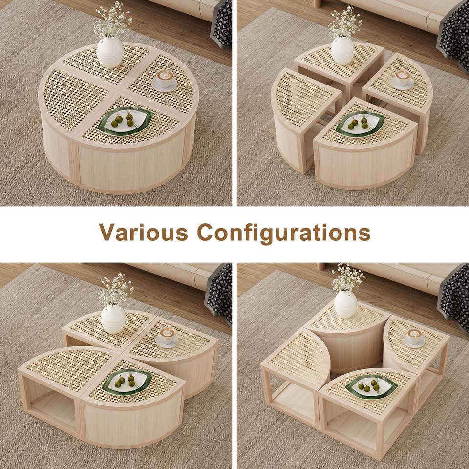 Tavolino da Caffè Modulare in 4 Pezzi, Rattan Naturale Chiaro, da Rotondo a Quadrato con Vano Portaoggetti