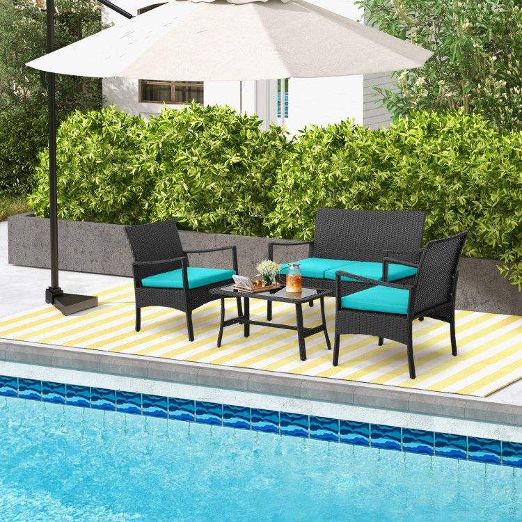 Set da Giardino in Rattan a 4 Pezzi con Tavolino in Vetro Temperato per Conversazioni all'Aperto