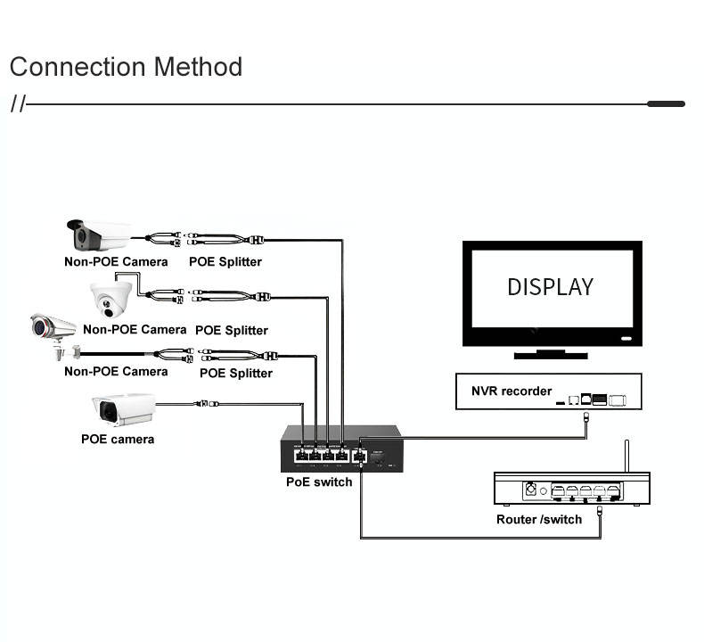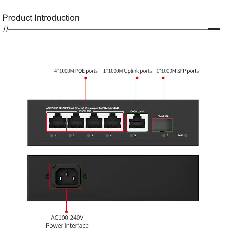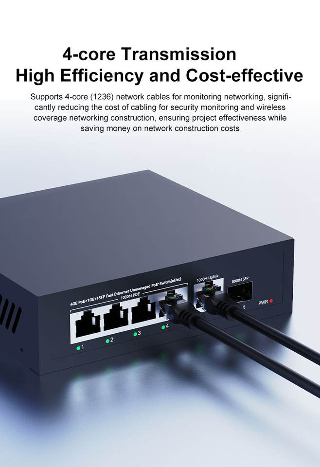 Product Specifications:4*1000M POE ports + 1*1000M Uplink port + 1*SFP Optical port