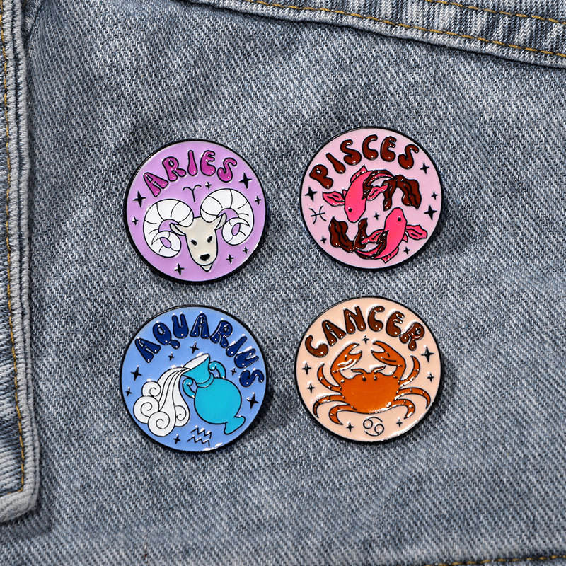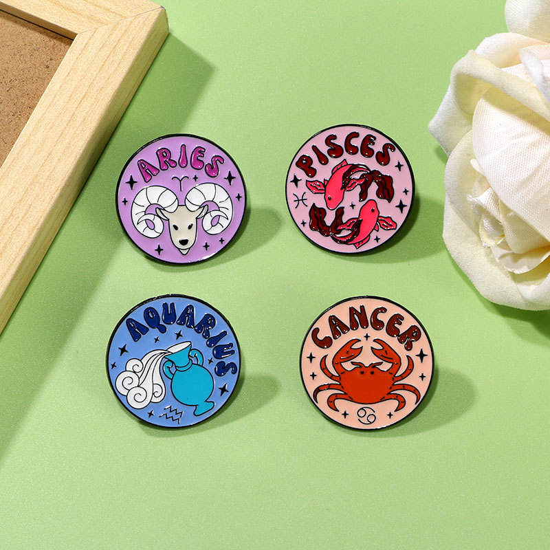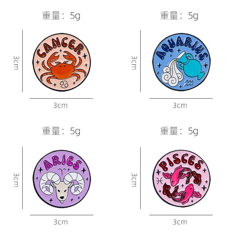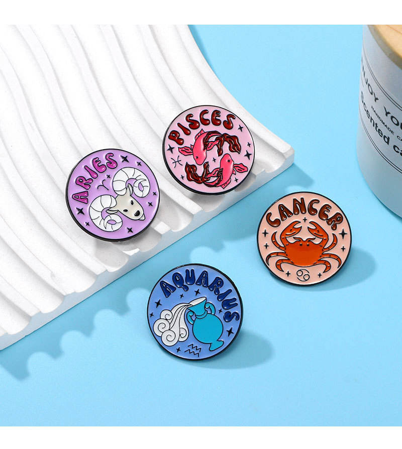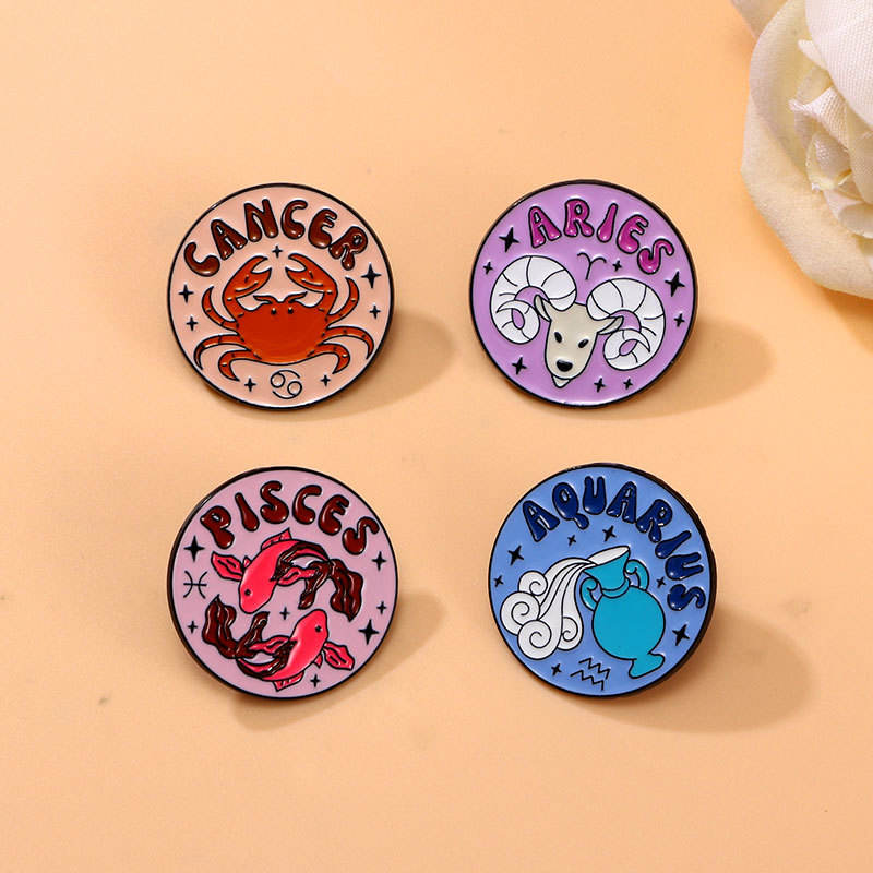 4 Styles Cartoon Twelve Zodiac Sign Soft Enamel Lapel Pins Crab Aries and Pisce Brooches for Clothing and Bags.