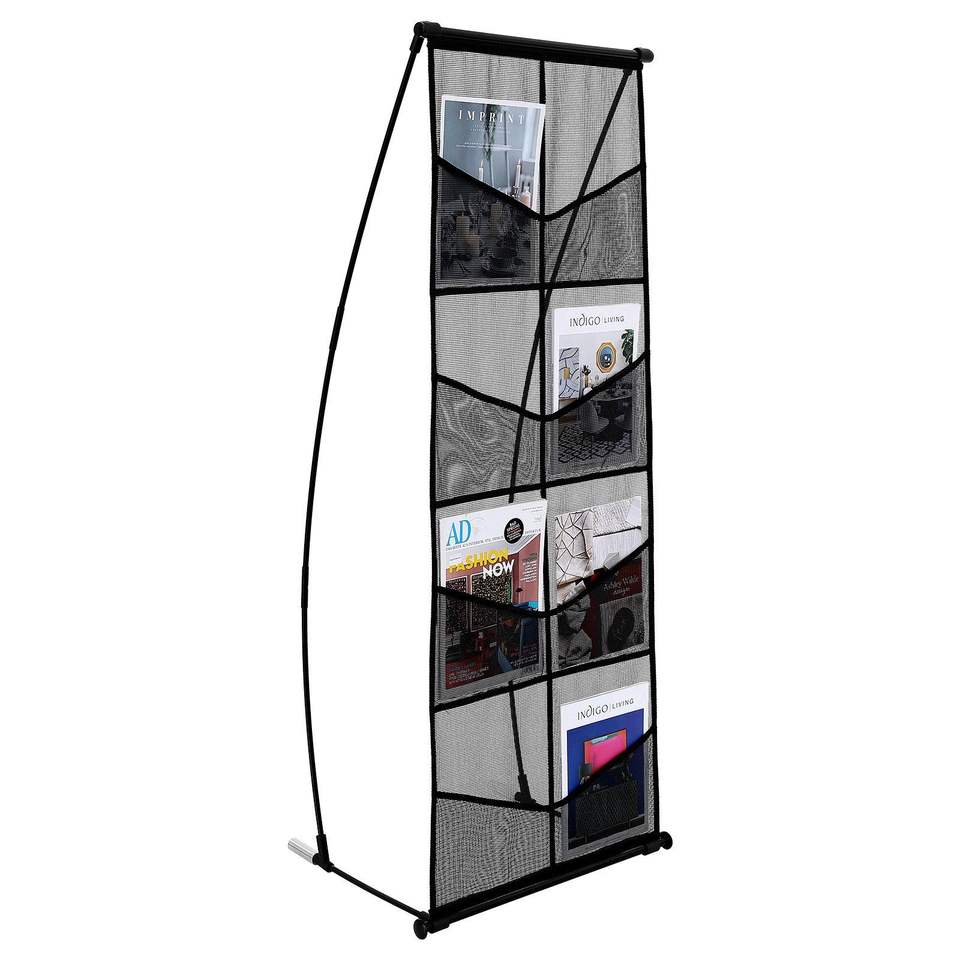 Espositore a 4 livelli con 8 tasche in rete leggera per libri, riviste, giornali, cataloghi e brochure, da terra