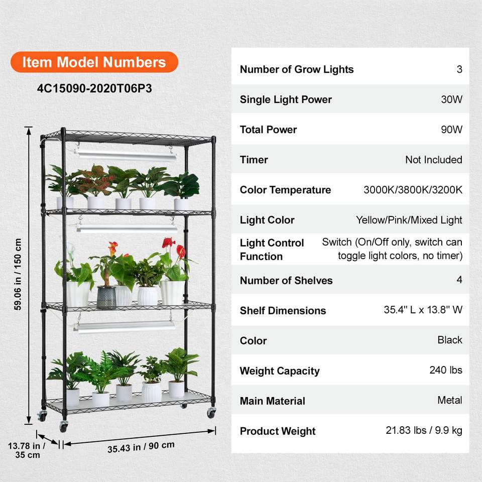 Supporto per Piante da Interno a 4 Livelli con Luce LED a Spettro Completo da 90W per una Crescita Sana delle Piante