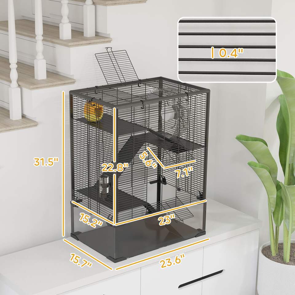 Gabbia per Criceti a 4 Piani con Fondo in Vetro Temperato, Ruota per Esercizio, Casetta, Bottiglia d'Acqua, Ciotola per Cibo, 61 x 41 x 80 cm