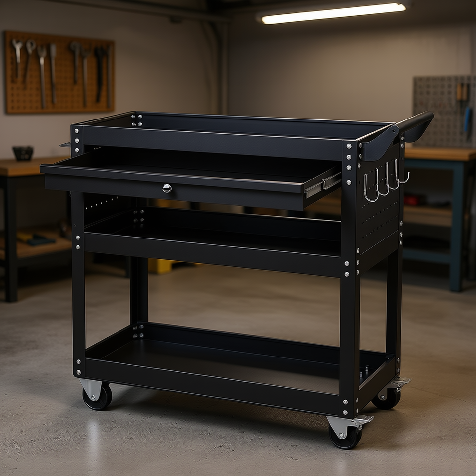 Carrello da Lavoro a 4 Ripiani con Cassetti, Capacità 350 Libbre, Organizzatore Porta Attrezzi con Pannello Forato, Sistema di Bloccaggio, Nero, per Uso in Garage