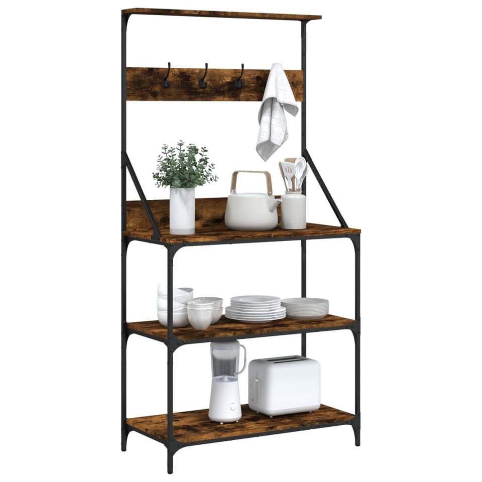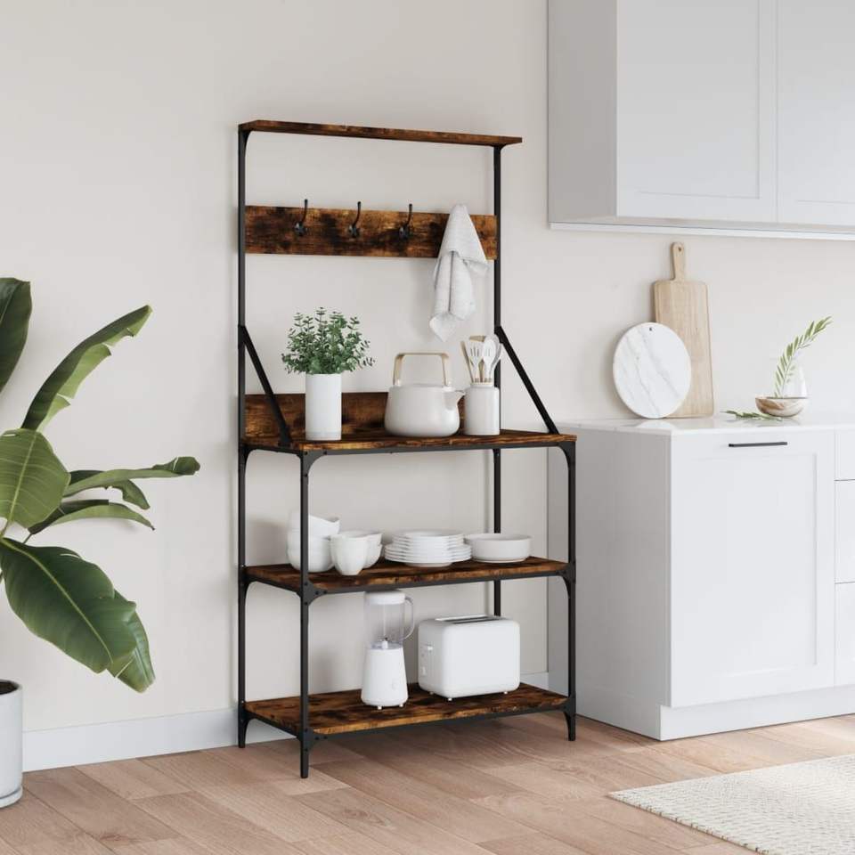 Scaffale da cucina a 4 ripiani in legno ingegnerizzato di rovere affumicato con ganci per riporre oggetti in cucina