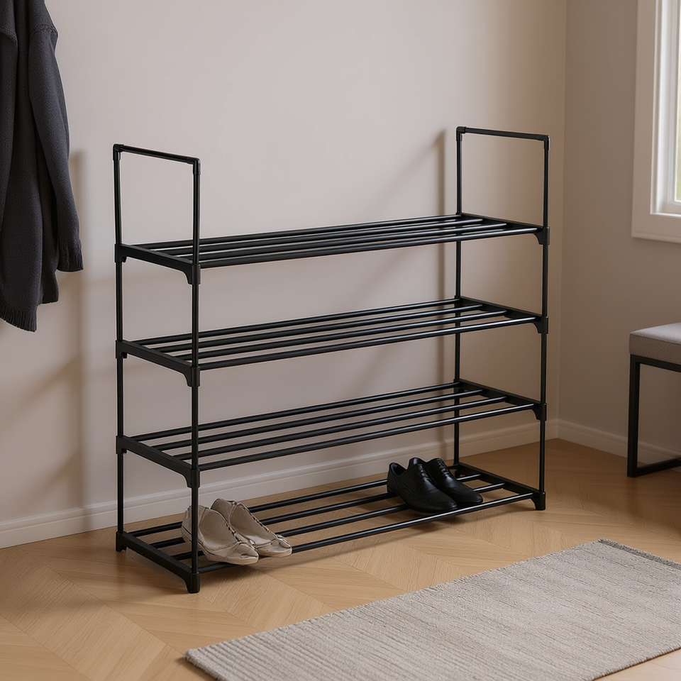 YS 4 Tier Black Metal Shoe Rack Freestanding Storage Organizer Modern Minimalist Design Entryway Bedroom Closet