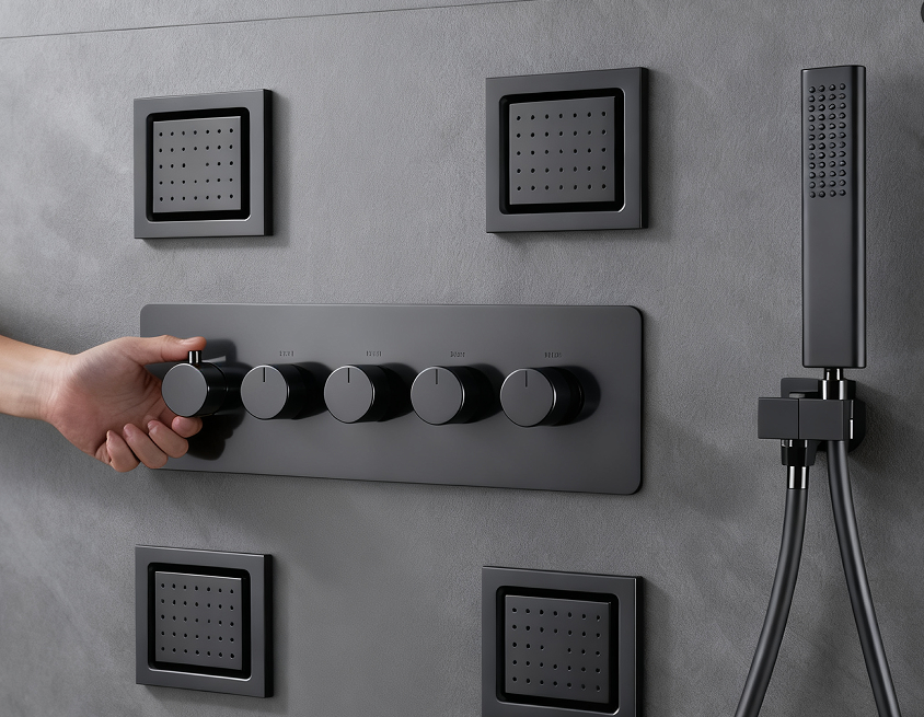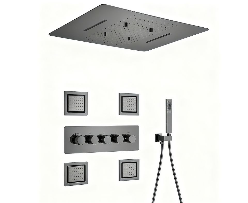 Miscelatore Doccia a Parete Nascosto in Ottone Grigio Antracite Spazzolato Oro con 4 Vie di Uscita e Funzione Deviatore, Flusso Controllabile