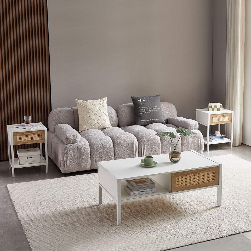 Tavolino da Caffè Moderno in Rattan Bianco da 102 cm con Porta Scorrevole e Gambe in Metallo per Soggiorno