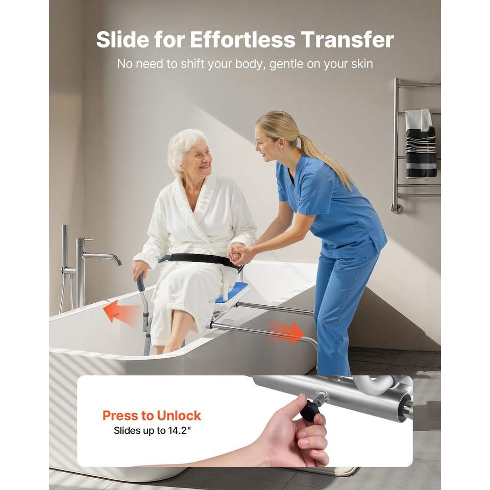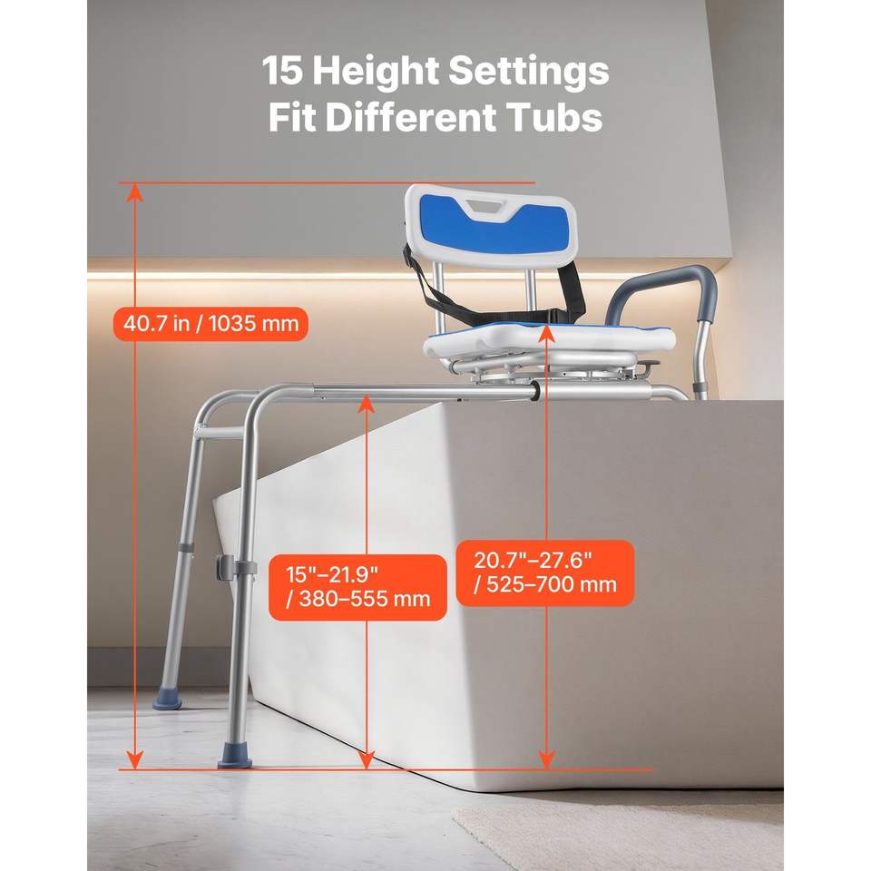 Sedia da doccia scorrevole da 180 kg con sedile girevole, panca imbottita per il trasferimento in vasca, con braccioli e schienale - Attrezzatura di sicurezza per il bagno