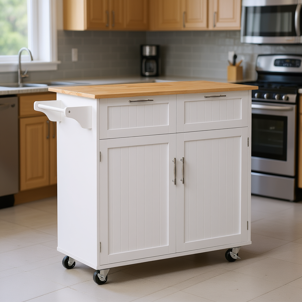 Isola da Cucina Moderna su Ruote Bianca 41 Pollici con Piano in Legno di Gomma 2 Cassetti con Ruote Modello D0100XFFKLP
