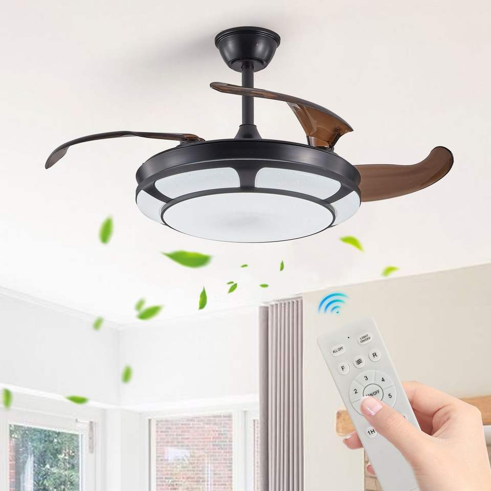 Ventilatore da Soffitto Moderno con Lampadario LED da 42 Pollici, Luce Retrattile, 6 Velocità, Pale Regolabili, Motore DC Silenzioso, Telecomando