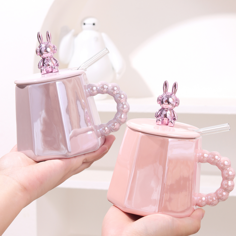 Tazza in Ceramica 3D da 420ml con Design Orso Violento e Coniglio, Tazza in Porcellana Ecologica con Coperchio e Cannuccia per Regalo, Caffè ed Erbe