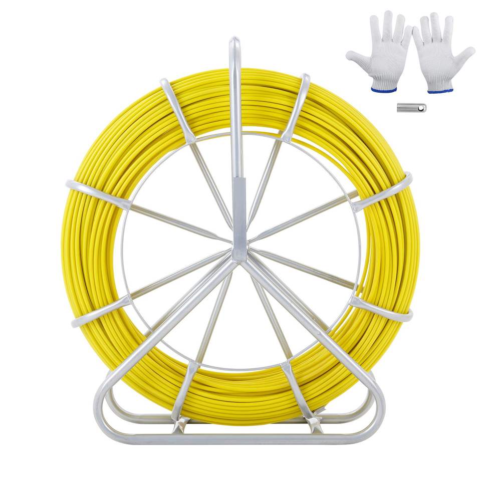 Cavo passacavi in fibra di vetro da 425 piedi e 1/4 di pollice con bobina in acciaio e 3 spazzole per la pulizia dei condotti