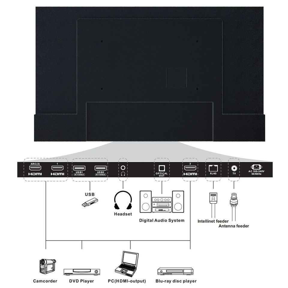 ARC & CEC * 3,USB * 2,AV,Ypbpr,RJ45, auricolare fuori, ottico, RF