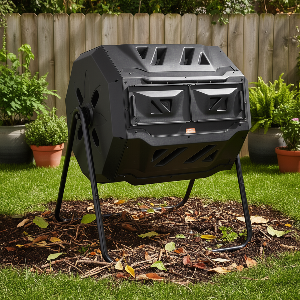 43 Gal Dual Chamber Composting Tumbler Black Steel Frame Manual Garden Composter Bin Outdoor Use