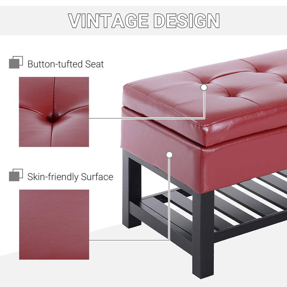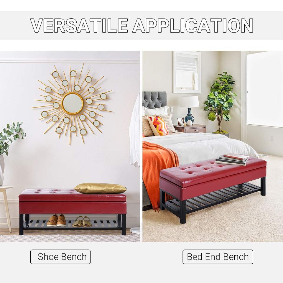 Panca contenitore imbottita in similpelle rosso carminio da 44 pollici con porta scarpe