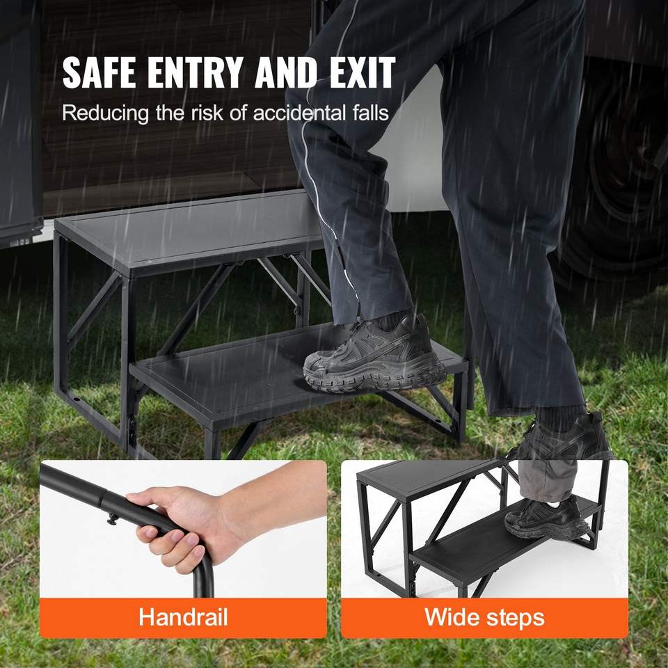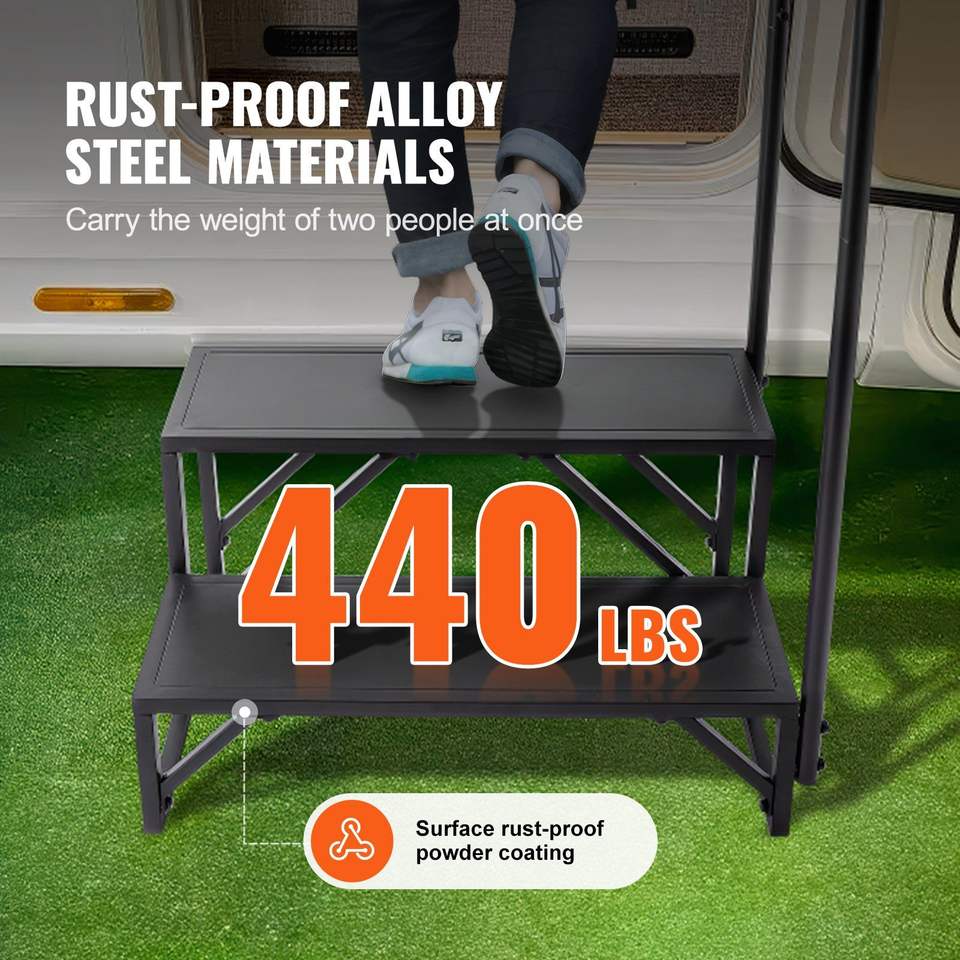 Scala per Camper a 2 Gradini in Acciaio al Carbonio Rinforzato, Capacità di Carico 440 LBS, Corrimano Antiscivolo, Accessori Esterni per Camper