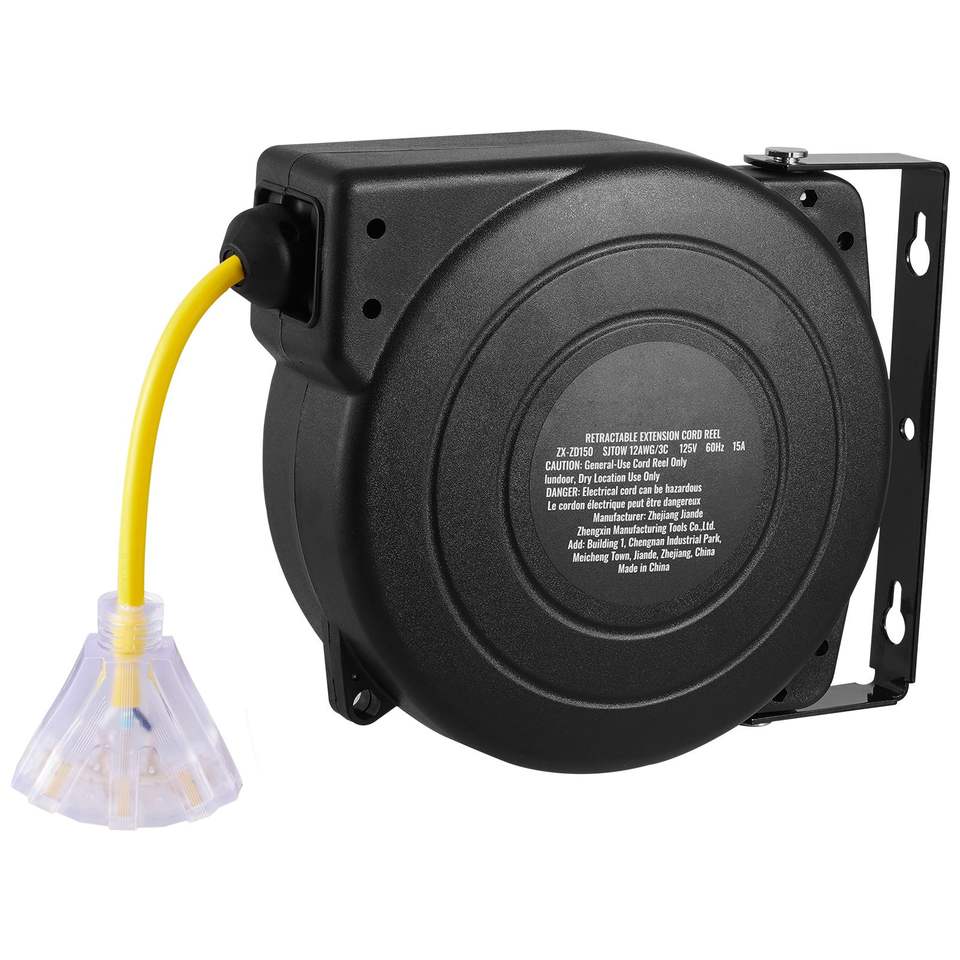 Avvolgicavo Elettrico Retrattile Professionale da 45 FT con Cavo 12AWG/3C SJTOW, 15 Amp, Presa Tripla Illuminata