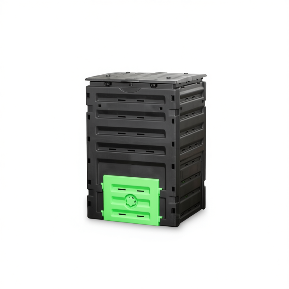 Compostiera da Giardino Nera 450L con Porte Scorrevoli e Aeratore Manuale per Uso Esterno