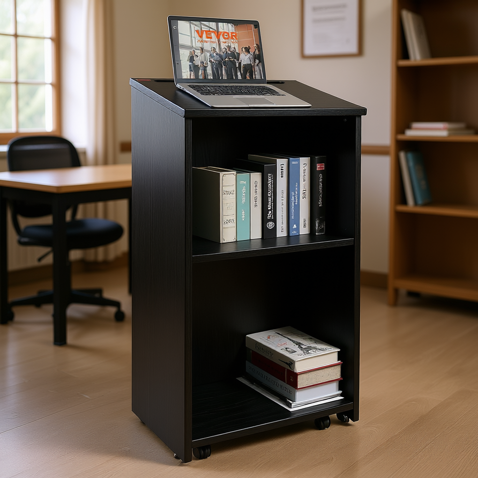 47-Inch Black Wood Podium Stand Rolling Wheels Slant Desktop Lectern for Church Office School Home Storage