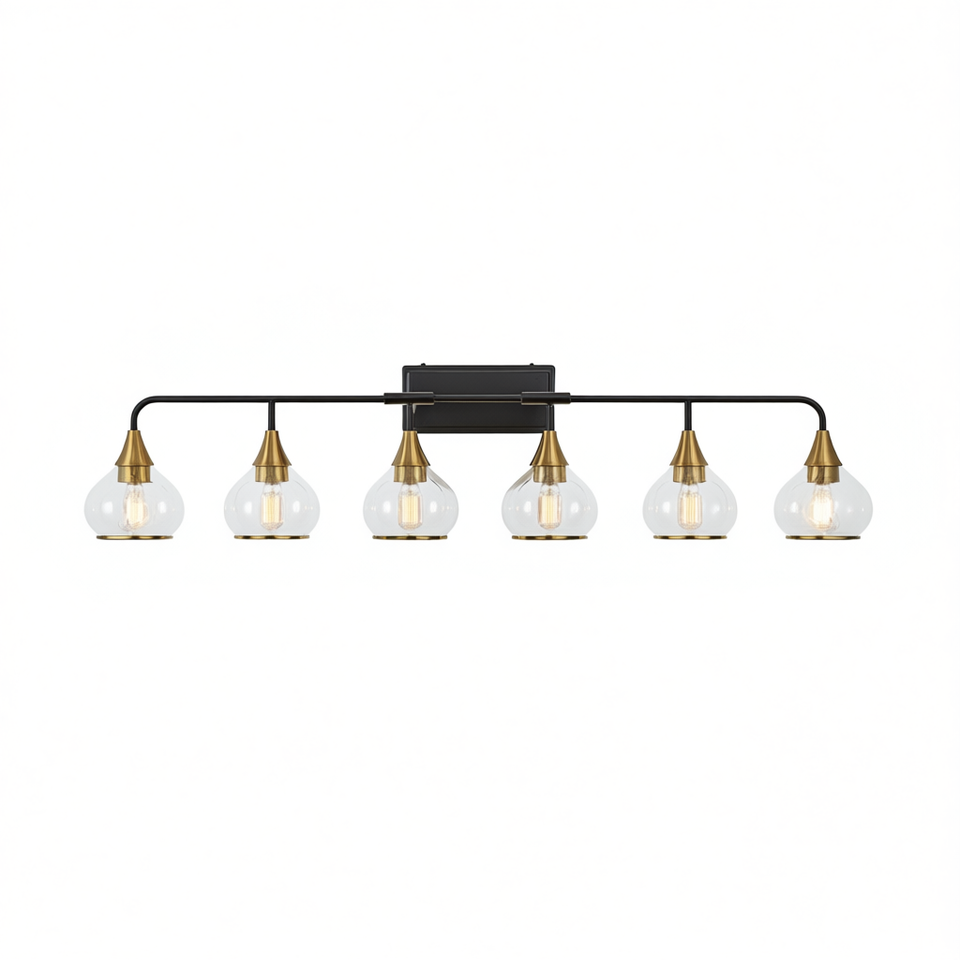 Moderna Lampada da Parete Industriale a 6 Luci in Ferro per Bagno, con Paralumi in Vetro Trasparente e Finitura Nero-Oro